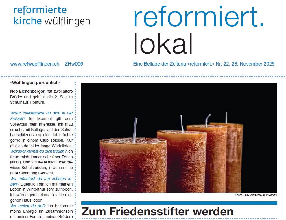 Willkommen auf der Homepage der Reformierten Kirchgemeinde Wülflingen. Wir freuen uns, dass Sie uns besuchen, und stellen uns Ihnen auf unseren Seiten gerne vor: Wir sind eine lebendige Gemeinde, die einiges in Bewegung bringt, Bewährtes vertieft und Neues wagt – auch mit Ihnen. Sie finden bei uns ein vielfältiges Angebot.